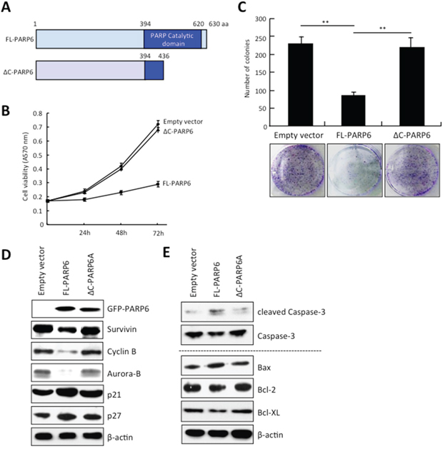 Figure 1: PARP6 inhibits cell growth and colony formation. A. A schematic illustration of the human PARP6 protein. PARP6 consists of 630 amino acid residues and has a PARP catalytic domain in C-terminal region. ΔC-PARP6 lacks the PARP catalytic domain. B. Cell proliferation after FL-PARP6 and ΔC-PARP6 overexpression in SW480 cells was measured by MTT assays. After transfection with the p-EGFP-empty, p-EGFP-FL-PARP6 or p-EGFP-ΔC-PARP6 plasmids, transfectant cells (1500 cells / well) were replated in 96-well plates. The MTT assay was performed to test the cell viability at 24 h, 48 h and 72 h. Values indicate mean ± SD (n=6). C. Colony formation aof FL-PARP6 and ΔC-PARP6 transfectant SW480 cells. Cells were plated in 6 cm dishes at a density of 500 cells per dish. After 2 weeks, number of colonies were counted. The data represent the means ± S.D. of three independent experiments **P < 0.01. D. Expression of cell cycle related proteins including Survivin, Cyclin B, Aurora-B, p21 and p27 in empty vector, FL-PARP6 and ΔC-PARP6 transfectant SW480 cells was examined by Western blot analysis. β-actin expression was used as a loading control. E. Expression of apoptosis related proteins including cleaved Caspase-3, Caspase-3, Bax, Bcl-2 and Bcl-XL in empty vector, FL-PARP6 and ΔC-PARP6 transfectant SW480 cells was examined by Western blot analysis. β-actin expression was used as a loading control.