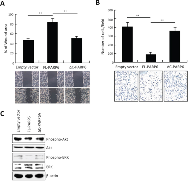 Figure 2: PARP6 inhibits invasion and migration. A. Empty vector, FL-PARP6 and ΔC-PARP6 transfectant cells were subjected to wound healing assays. The uncovered areas as a percentage of the original wound area were quantified. **, P < 0.01 is based on the Student t test. All results were from three independent experiments. Error bars, SD. B. Empty vector, FL-PARP6 and ΔC-PARP6 transfectant cells were subjected to in vitro invasion assays using matrigel. Number of cells that invaded through matrigel was counted. We performed the assay 3 times and 5 randomly selected fields from each membrane were counted under a light microscope at x100 magnification. **, P < 0.01 is based on the Student t test. Error bars, SD. C. Expression of phospho- and total protein of Akt and ERK in empty vector, FL-PARP6 and ΔC-PARP6 transfectant SW480 cells by Western blot analysis. β-actin expression was used as a loading control.