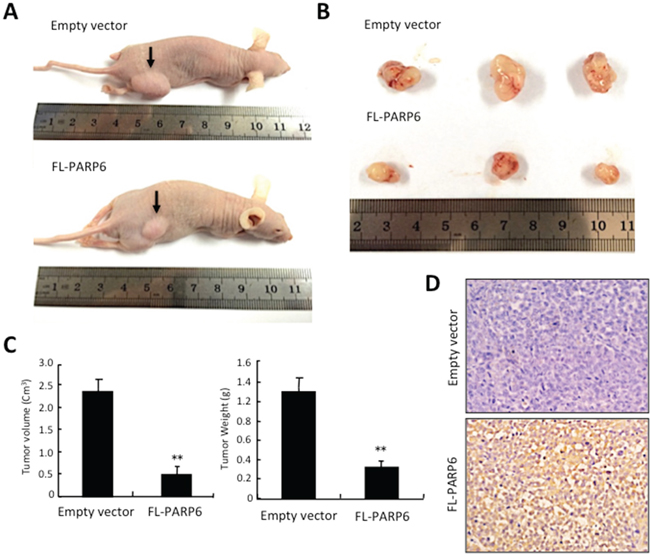 Figure 3: PARP6 inhibits tumor formation in vivo. A. Empty vector and FL-PARP6 transfectant cells were subcutaneously inoculated into the lower right flank of the nude mice. B. Representative images of empty vector and FL-PARP6 transfectant tumors following subcutaneous injection. C. The tumor volume was calculated using the following formula: tumor volume (mm3) =0.5 × length (mm) × width2 (mm2). The tumor weight was measured. Left graph shows tumor volume, and right graph shows tumor weight in empty vector and FL-PARP6 transfectant tumors. **P < 0.01. D. Expression of PARP6 protein in empty vector and FL-PARP6 transfectant tumors was examined by immunohistochemistry.