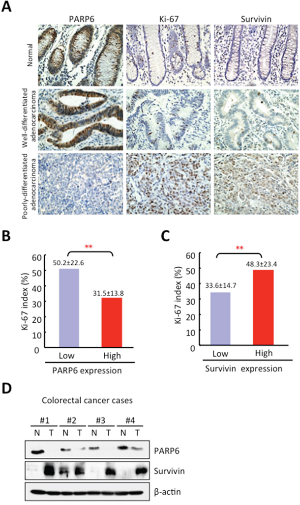 Figure 4: Correlation between PARP6 and Survivin expression in CRC. A. Expression of PAPR6 and Survivin in 238 CRC cases was examined by immunohistochemistry. Representative images of PARP6, Ki-67 and Survivin in normal colonic mucosa, well differentiated adenocarcinoma and poorly differentiated adenocarcinoma cases. B. Correlation between PARP6 and proliferation marker, Ki-67 in CRC cases by immunohistochemistry. Graph shows Ki-67 index in CRC cases with low or high expression of PARP6. C. Correlation between PARP6 and Survivin in CRC cases by immunohistochemistry. Graph shows Ki-67 index in CRC cases with low or high expression of Survivin. D. The expression of PAPR6 and Survivin were determined in 4 CRC tissues and normal adjacent colorectal tissues by Western blot analysis. β-actin was used as a loading control.