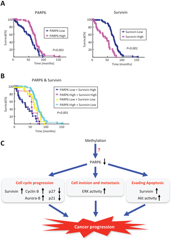 Figure 5: The prognostic value of PAPR6 and Survivin in CRC cases. Kaplan–Meier curves with a univariate analysis (log-rank) for colorectal cancer according to the expression of PAPR6 and Survivin. A. Left graph shows Kaplan–Meier curves for colorectal cancer according to the expression of PAPR6. The prognosis for patients with high PAPR6 expression (n=66) was better than the prognosis for patients with low PAPR6 expression (n=79) (P<0.001). Right graph shows Kaplan–Meier curves for colorectal cancer according to the expression of Survivin. The prognosis for patients with high Survivin expression (n=49) was poorer than the prognosis for patients with low Survivin expression (n=96) (P<0.001). B. The survival analysis of the simultaneous expression of PARP6 and Survivin. The prognosis for patients with both high PARP6 expression and low Survivin expression is the best (n=54), and the patients with the worst prognosis exhibited both low PARP6 expression and high Survivin expression (n=37). The prognoses of the other two groups were in the middle (n=54) (P<0.001). C. Schematic model of the role of PARP6 in CRC progression.