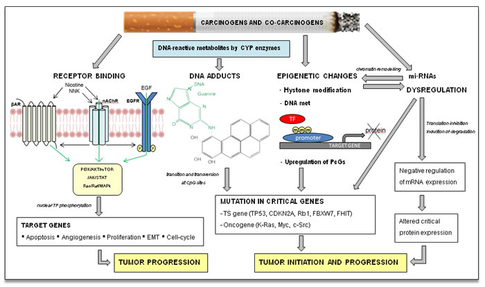 Figure 1: Tobacco smoke carcinogenesis. The main recognized mechanism of tobacco initiation of carcinogenesis is the formation of DNA adducts by polycyclic aromatic hydrocarbons and aromatic amines, with consequent deregulation of critical oncogenes and/or tumor suppressor (TS) genes. Tobacco smoke can influence protein expression of squamous cell cancer patients through induction of reversible epigenetic changes and miRNAs dysregulation; these pathways are also inter-related. Nicotine and its oncogenic derivatives are unable to initiate carcinogenesis, but can promote tumor growth through activation of multiple kinase cascade, acting directly on nicotinic acetylcholine receptor (nAChR) or indirectly on parallel cell surface receptors. βAR, beta adrenergic receptor kinase; CDKN2A, cyclin-dependent kinase inhibitor 2A; CpG, C-phosphate-G; c-Src, cellular Src kinase; CYP, cytochrome p450; FBXW7, F-box and WD repeat domain containing 7; FHIT, fragile histidine triad; m, methyl-CpG; Myc, myelocytomatosis oncogene; nAchR, Nicotinic acetylcholine receptor; NNK, nicotine-derived nitrosamine ketone; PcGs, polycomb-group protein; Rb1, retinoblastoma1; TF, transcription factor.