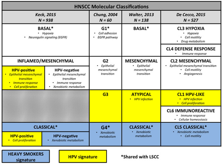 Figure 2: Molecular subtypes in head and neck squamous cell carcinomas. The figure summarizes the molecular subtypes of head and neck squamous cell carcinomas according to the four different molecular classifications available in the literature with the main dysregulated functional pathways for each subgroup. We highlighted molecular subtypes associated with human papillomavirus infection by yellow boxes, those associated with smoking habits by blue boxes, and we marked by * the subgroups corresponding to lung squamous cell carcinoma expression subtypes. HNSCC, head and neck squamous cell carcinoma; HPV human papillomavirus; LSCC, lung squamous cell carcinoma.