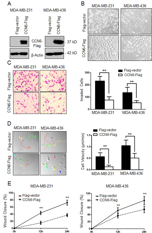 Figure 1: CCN6 overexpression induces phenotypic changes towards mesenchymal to epithelial transition (MET) and decreases breast cancer cell invasion and motility. A. Western blot analysis of CCN6 protein level on breast cancer cells MDA-MB-231 and MDA-MB-436 following lentiviral transduction with CCN6-Flag or Flag-Vector control. β-Actin was used as loading control. B. Representative phase contrast images show that CCN6 overexpression leads to a morphological change from mesenchymal-like to epithelial when compared to controls (200X magnification). C. CCN6 overexpression reduces invasion of MDA-MB-231 and -436 cells compared to controls using a reconstituted Boyden basement membrane invasion chamber assay. Left, representative images of stained chambers. Right, average number of invaded cells of each cell line ± SD. D. Left, representative images displaying MTrackJ individual MDA-MB-231 and -436 cell tracks, colored dots and connecting lines, from 24 hour time-lapse videos of CCN6-Flag or Flag-Vector cells. Each dot represents a 10 minute time span and closely spaced dots indicate less movement over the elapsed time versus widely spaced dots. Right, bar graphs show that CCN6 overexpressing cells are significantly slower than controls as demonstrated by the average cell velocity ± SEM (Student’s t-test, *p < 1×10−5, n ≥ 25 cells per condition). E. Wound healing assays demonstrate that CCN6 overexpressing cells exhibit reduced migration compared to controls. For all experiments, Data are representative of 3 independent experiments. * p < 0.05 ** p < 0.001.