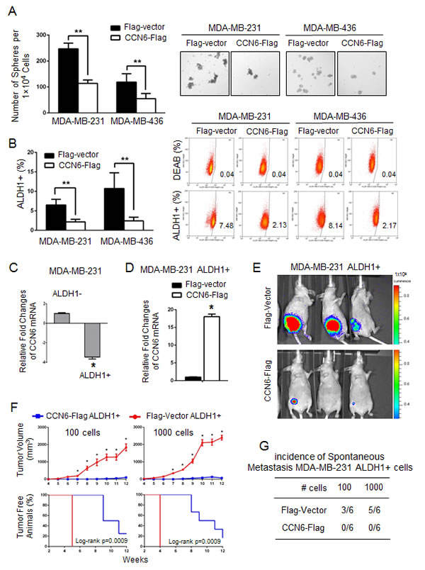 Figure 2: CCN6 overexpression reduces TICs in aggressive breast cancer cells and their tumorigenic ability in vivo. A. CCN6 overexpression in MDA-MB-231 and -436 cells significantly reduces the number of tumorspheres compared to controls. Bars show the average sphere number ±SD per 1x104 plated cells. Representative images of spheres after 7 days in culture (magnification: 200x). B. CCN6 overexpression reduces the percentage of ALDH1+ cells using the ALDEFLUOR assay by flow cytometry compared with controls. The percentage of ALDEFLUOR positive cells ± SD is shown. C. CCN6 quantitative RT-PCR in MDA-MB-231 ALDH1+ and ALDH1- cells. D. CCN6 quantitative RT-PCR in MDA-MB-231 ALDH1+ cells transduced with CCN6-Flag or Flag-Vector. E. ALDH1+ MDA-MB-231 cells transduced with CCN6-Flag or with Flag-Vector were injected into the cleared mammary fat pads of NOD/SCID mice (100 and 1000 cells, 6 mice per condition). Representative images of mice injected with 100 cells analyzed at week 11 using luciferase bioluminescence imaging. F. Top, CCN6 overexpression significantly reduces the volume of tumors formed by MDA-MB-231 ALDH1+ cells compared with controls. Average tumor volume ± SEM for weeks 4-12 post injection for all conditions (mixed regression model, *p < 0.05). Bottom, Kaplan Meier plot shows that CCN6 overexpression significantly increases the time to tumor initiation in MDA-MB-231 ALDH1+ cells compared with controls (log-rank p = 0.0009 for both conditions). G. Table shows the number of mice with metastasis/total number of mice in each group (n = 6 mice/group). All metastasis were to the lungs, except one to the soft tissues adjacent to the vertebral column in a Flag-Vector mouse 1,000 cell group. Metastases were diagnosed by histopathology analyses of paraffin-embedded sections.