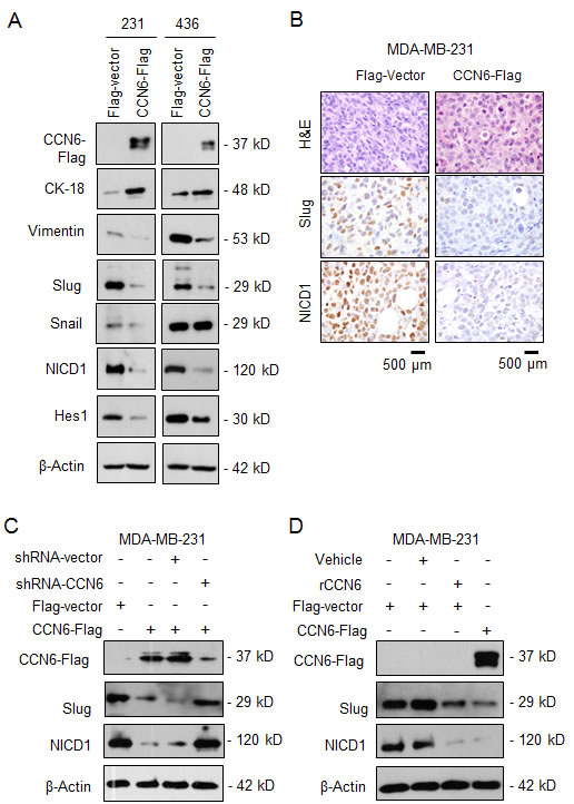 Figure 3: CCN6 regulates the expression of Slug and Notch1 signaling pathway. A. Immunoblots of MDA-MB-231 and -436 cells transduced with CCN6-Flag or Flag-Vector probed with the indicated antibodies. B. Representative images of mammary xenografts derived from MDA-MB-231 transduced with CCN6-Flag and Flag-Vector subjected to immunohistochemistry for the indicated proteins (600x magnification). C. Immunoblot of CCN6-Flag and Vector-Flag MDA-MB-231 cells treated with lentivirus containing CCN6 short hairpin (shRNA) or scrambled controls. D. Immunoblot of MDA-MB-231 cells treated with recombinant CCN6 (rCCN6) protein (200 ng/mL) or vehicle.