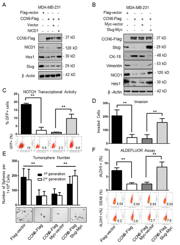 Figure 4: CCN6-dependent reduction of TICs requires Slug downregulation. A. Immunoblot of MDA-MB-231 CCN6-Flag and Flag-Vector cells transiently transduced with constitutively active NICD1 in a retrovirus vector or vector control [65]. B. Immunoblot of MDA-MB-231 CCN6-Flag and Flag-vector transduced with a Slug-Myc construct in a lentiviral vector or control.