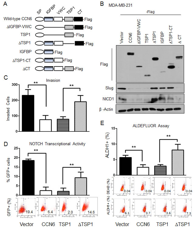 Figure 5: The TSP1 domain of CCN6 is required for CCN6-mediated functions A. Schematic diagram of CCN6 and the generated 6 truncated mutants with C-terminal Flag-tag. CCN6 protein contains four domains: IGFBP, VWC, TSP1, and CT with an N-terminal signal peptide (SP). B. Immunoblot of MDA-MB-231 cells stably transduced with CCN6 and CCN6 truncated mutants probed with anti-Flag, anti-NICD1, anti-Slug, and anti-β-actin. C. Matrigel invasion assay of MDA-MB-231 cells expressing ectopic CCN6, a deletion mutant containing only the TSP1 domain (TSP1), a deletion mutant lacking the TSP1 domain (∆TSP1) or control. D. GFP-NOTCH promoter reporter assay of cells in C. Percentages of GFP-expressing cells ± SD E. ALDEFLUOR assay of cells in C. The percentage of ALDEFLUOR positive cells ± SD is shown. *P < 0.05, **P < 0.005, two-tailed Student’s t test.