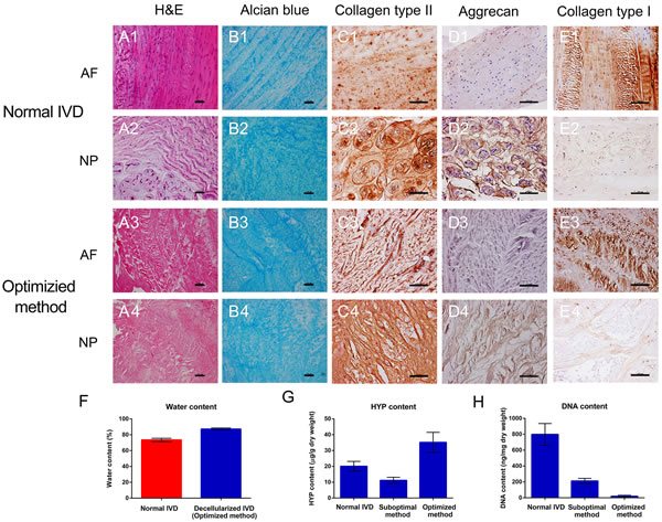 Figure 1: Optimized decellularization method preserved ECM components. H&E, Alcian blue, collagen type II, AGN and collagen type I staining of normal A1.-2, B1.-2, C1.-2, D1.-2, E1.-2 and optimized method A3.-4, B3.-4, C3.-4, D3.-4, E3.-4. The content of DNA F., HYP G. and water H. revealed the excellent biological characteristics of optimized method group (n = 5 per study group). Optimized method includes 2% Triton X-100 for 24 h, 1% SDS for 24 h and 200 U/ml DNAase for 12 h. Abbreviations: IVD = intervertebral disc, AF = annulus fibrous, NP = nucleus pulposus, HYP = hydroxyproline. A-E: Scale bar 100μm.