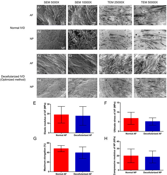Figure 2: Optimized decellularization method preserved ECM structure and mechanical properties. Ultrastructure analysis reaveled that the collagen fibril meshwork in optimized method group A3.-4, B3.-4, C3.-4, D3.-4 is preserved and is similar to normal IVD A1.-2, B1.-2, C1.-2, D1.-2. The elastic modulus E., ultimate stress F. and maximum elongation G. indicate the mechanical change in AF after decellularization. The compressive modulus H. of normal NP and decellularized NP were measured at a 1 Hz loading frequency (n = 6 per study group). Abbreviations: IVD = intervertebral disc, AF = annulus fibrous, NP = nucleus pulposus.