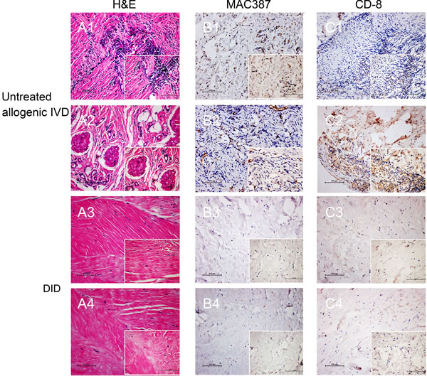Figure 3: Decellularized allogenic IVD induced minimal immunological reaction in vivo. H&E, MAC387 and CD-8 staining of untreated allogenic IVD A1.-2, B1.-2 and C1.-2 and decellularized allogenic IVD A3.-4, B3.-4 and C3.-4 IVD were performed after 1 month of subdermal implantation in rabbits. * Blood vessels, ▲ Foreign body granulomatous inflammation, → positive signal of MAC386 or CD-8. Abbreviations: IVD = intervertebral disc, DID = decellularized intervertebral disc.