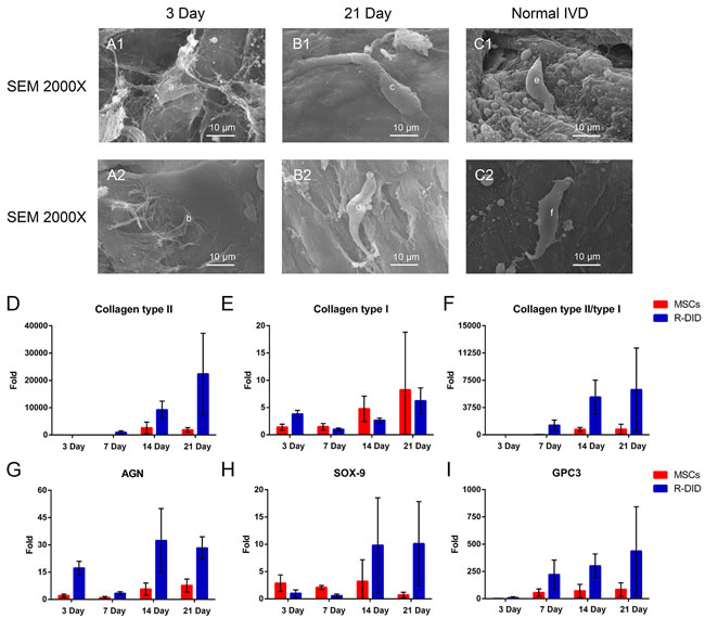 Our histology result revealed morphological changes when MSCs cells are seeded on the decellularized IVD. Therefore, we further evaluated the morphology of these cells using SEM. SEM found IVD-like cell differentiation was induced with MSCs seeded in the decellularized IVD. The dynamic morphology changes were observed in Figure 5. At low magnification (×2000), the thin and flat cell anchored onto the decellularized IVD surface, stretching with lengths that ranged to approximately 10 μm on the three-day (Figure 5 A1-5 A2). After 21 days of culturing, the cell body translated into a column or strip-like shape, and the cell shape was similar to normal intervertebral disc cells (Figure 5 B1-2 and 5 C1-2).