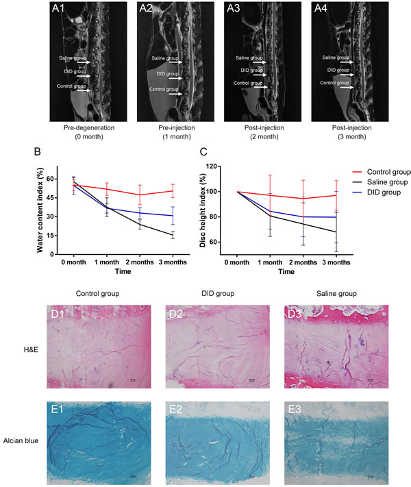 Figure 6: Decellularzied allogeneic IVD prevented disc degeneration in vivo. Continuous and dynamic changes of IVD magnetic resonance imaging (MRI) on T2-weighted images at different time points A.. Water content index B. and disc height index C. indicated by MRI. H&E and Alcian blue staining of normal (control), DID and saline IVDs at 2 months after injection (n = 5 per study group per time point). DID group: allogeneic IVD-derived ECM microparticles. Abbreviations: DID = decellularized IVD.