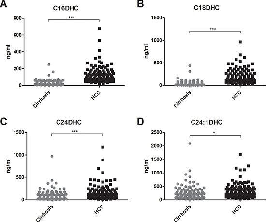 Figure 1: Serum dihydroceramides are upregulated in HCC patients. Both long chain DHC’s (C16DHC and C18DHC) as well as very long chain DHC’s (C24DHC and C24:1DHC) show significantly higher concentrations in the serum of HCC patients as compared to patients with liver cirrhosis (P < 0.001 for C16DHC, C18DHC, C24DHC and P < 0.05 for C24:1DHC). DHC: dihydroceramide.