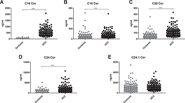 Figure 2: Ceramides accumulate in the serum of patients with HCC. Except for the unsaturated derivative of C24Cer, C24:1Cer (2E), all serum Cer’s assessed were upregulated in the serum of HCC patients as compared to patients with liver cirrhosis (P < 0.001). Cer: ceramide.