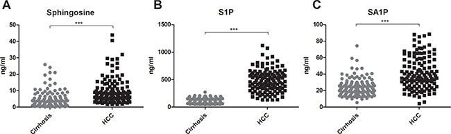 Figure 3: Sphingosine, S1P and SA1P in HCC patients. Serum sphingosine, S1P and SA1P are highly elevated in HCC patients as compared to patients with liver cirrhosis (P < 0.001). S1P: sphingosine 1-phosphate, SA1P: sphinganine 1-phosphate.
