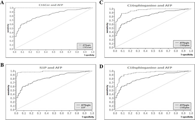 Figure 4: Diagnostic performance of serum sphingolipids as compared to AFP in the differentiation of HCC from liver cirrhosis. ROC analysis identified serum SL parameters with a superior diagnostic accuracy as compared to AFP, the only widely available serologic marker of HCC. ROC: receiver operating curve, SL: sphingolipid, AFP: alpha fetoprotein, AUC: area under the curve, HCC: hepatocellular carcinoma.