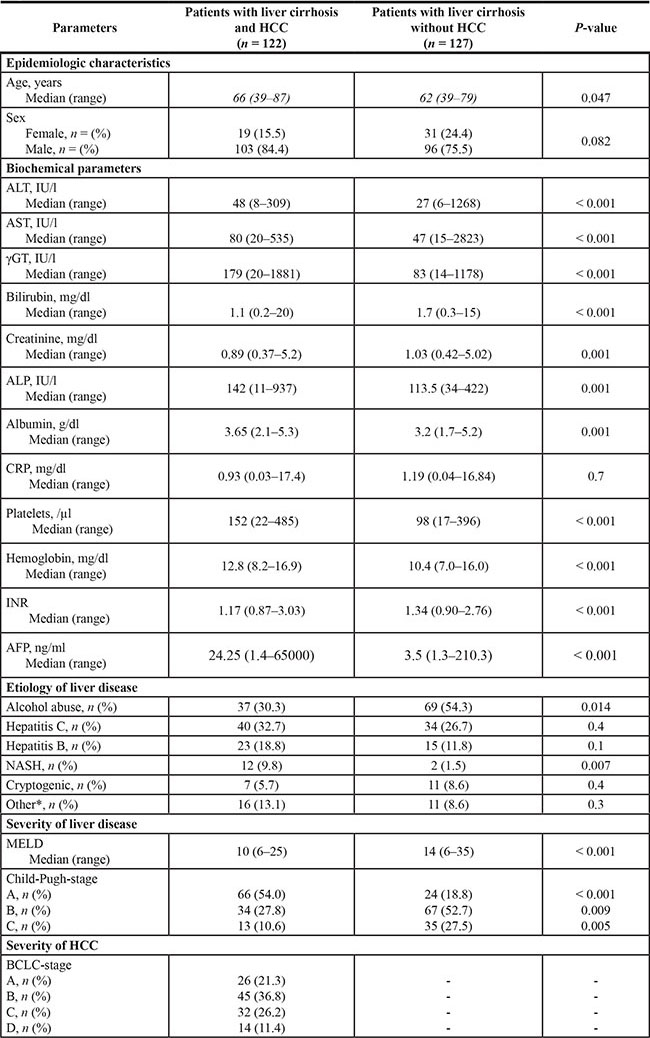 Missing data: ALT levels were missing in 2 HCC patients, AST levels were missing in 2 HCC patients, γGT levels were missing in 2 HCC patients, Bilirubin levels were missing in 1 HCC patient, ALP levels were missing in 3 HCC patients and in 1 patient with liver cirrhosis, Albumin levels were missing in 4 HCC patients and in 2 patients with liver cirrhosis, CRP levels were missing in 31 HCC patients and in 3 patients with liver cirrhosis, Hemoglobin levels were missing in 1 HCC patient, AFP levels were missing in 14 HCC patients and in 32 patients with liver cirrhosis.