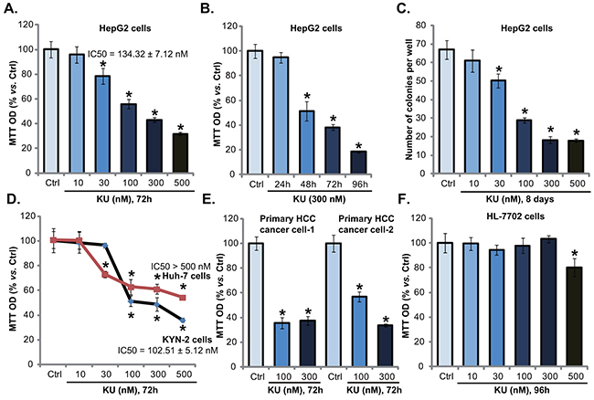 Figure 1: KU-0060648 inhibits HCC cell proliferation. HepG2 A-C. Huh-7 D. and KYN-2 (D) HCC cells, as well as the primary human HCC cells E. line-1/-2) and HL-7702 human hepatocytes F. were either left untreated (“Ctrl”, same for all figures), or treated with applied concentrations of KU-0060648 (“KU”, 30-500 nM), cells were then cultured for indicated time. Cell proliferation was tested by MTT assay (A and B, D-F) or clonogenicity assay (C). IC-50 was calculated by the SPSS software (A and D). Experiments in this figure were repeated four times, with similar results obtained. n=5 for each repeat. Bars stand for mean ± SD * p < 0.05 vs. group “Ctrl”.