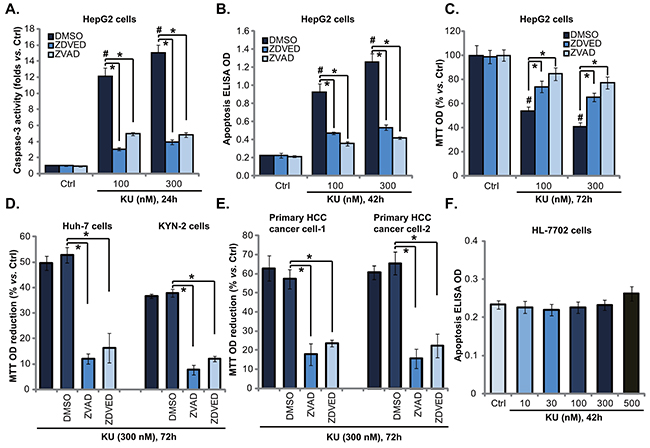 Figure 2: KU-0060648 induces HCC cell apoptotic death. HepG2 A-C. Huh-7 D. and KYN-2 (D) HCC cells, as well as the primary human HCC cells E. line-1/-2) and HL-7702 human hepatocytes F. pretreated with or without z-DEVD-fmk (“ZDEVD”, 40 μM) or z-VAD-fmk (“ZVAD”, 40 μM) for 1 h, were treated with applied concentrations of KU-0060648 (“KU”), cells were then cultured for indicated time, cell apoptosis was examined by the caspase-3 activity assay (A) or the Histone DNA apoptosis ELISA assay (B and F). Cell proliferation was tested by MTT assay (C-E). Experiments in this figure were repeated four times, with similar results obtained. n=5 for each repeat. Bars stand for mean ± SD #p < 0.05 vs. group “Ctrl”. *p < 0.05.