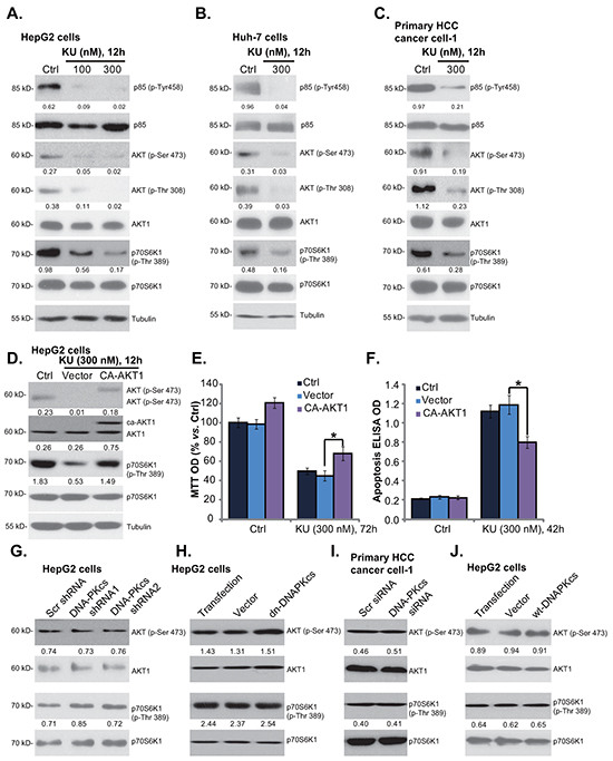 Figure 4: KU-0060648 inhibits PI3K-AKT-mTOR activation in HCC cells. HepG2 A. Huh-7 B. and primary human HCC cells C. line-1) were treated with applied concentrations of KU-0060648 (“KU”) for indicated time, expressions of listed kinases and Tubulin were tested by Western blotting. Stable HepG2 cells expressing constitutively active AKT1 (CA-AKT1) or empty vector (“Ad-GFP”), were either left untreated (“Ctrl”), or treated with KU-0060648 (“KU”, 300 nM) for indicated time. Listed proteins were detected by Western blotting D. Cell proliferation E. and apoptosis F. were also tested. Expressions of listed kinases in HCC cells described in Figure 3 were tested G-J. Kinase phosphorylation (vs. total kinase) was quantified. Experiments in this figure were repeated three times, with similar results obtained. n=5 for each repeat (E and F). Bars stand for mean ± SD *p < 0.05.