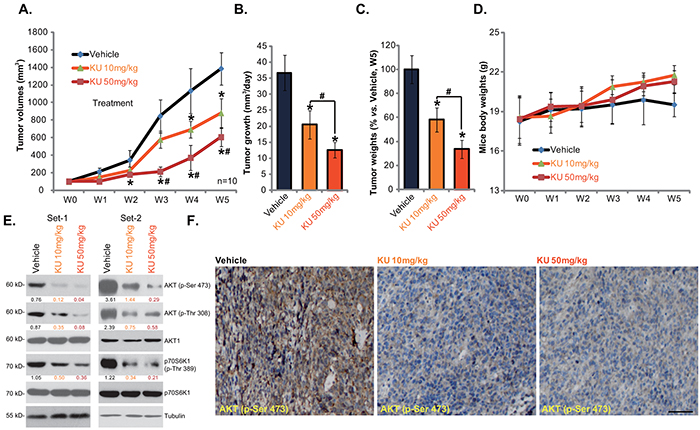 Figure 5: KU-0060648 suppresses HepG2 xenograft growth in nude mice. HepG2 bearing nude mice (n=12 for each group: 10 for growth assay, 2 for signaling assay) were administrated with KU-0060648 (i.p. 10 and 50 mg/kg bodyweight, daily, for 21 days) or the vehicle control (saline), tumor volumes (in mm3) A. and mice body weights (in gram) D. were presented weekly, tumor daily growth was also calculated B. At the end of the experiments (week-5), tumors were separated through surgery and weighted C. Two weeks after initial KU-0060648 administration, two mice per group were sacrificed, HepG2 tumor tissues were isolated for Western blotting assay E. or IHC staining assay F. of indicated proteins, representative p-AKT (Ser473) IHC images were presented (Bar=50 μm) (F). Kinase phosphorylation (vs. total kinase) was quantified (E). Experiments in this figure were repeated twice, with similar results obtained. Bars stand for mean ± SD. “w” stands for week. *p < 0.05 vs. group “Vehicle”. #p < 0.05 vs. KU-0060648 at 10 mg/kg group.