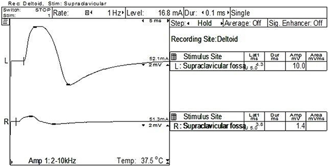 Figure 2: EMG of one case with right RIBP. EMG showed prolonged duration and increased amplitude for the action potential of right deltoid (duration 16.2±3.5 ms; amplitude 585±282 μV).