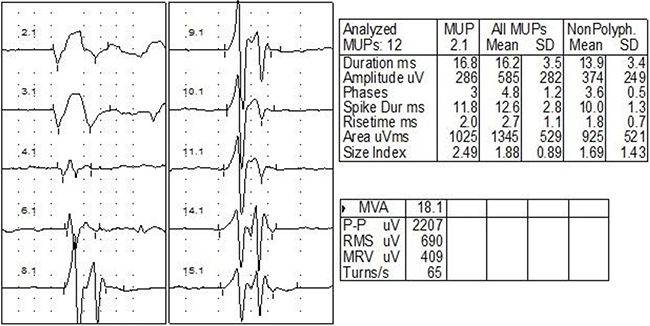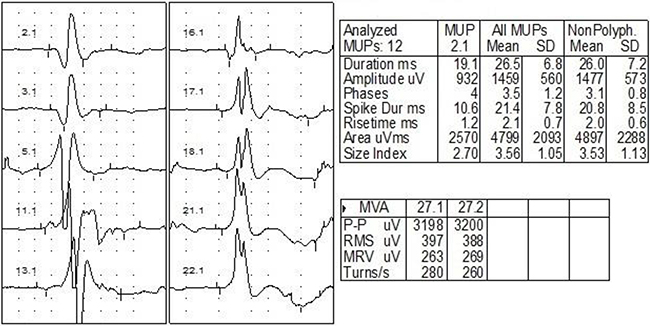 Figure 3: EMG of one case with bilateral RIBP. EMG showed prolonged duration and increased amplitude for the action potential of biceps branchi (duration 26.5±6.8 ms; amplitude 1459±560 μV).
