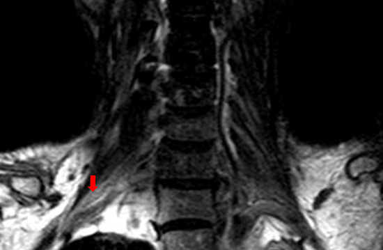 Figure 4: The T1-weighted coronal MRI scan of one case with unilateral RIBP. The MR imaging showed high intensity within the left brachial plexus (red arrow), compared with the normal right brachial plexus.