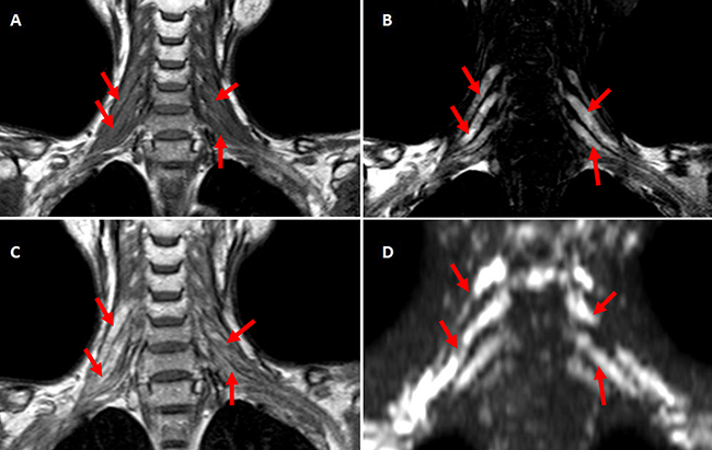 Figure 5: A-D. The coronal MRI scan of one case with bilateral RIBP T1-weighted coronal MRI scan showed bilateral brachial plexus were swollen with hyper-intensity. (A) C-5~C-8 roots and corresponding trunks of brachial plexus showed prolonged T2 relaxation time at T2-weighted MR imaging (B), high intensity at Post-contrast T1-weighted imaging (C) and DWIBS (D) (indicated with red arrows).