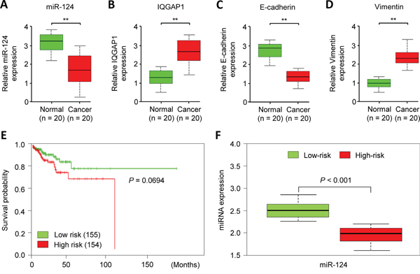 To test whether miR-124/IQGAP1 axis is clinically relevant in EC, we examined tumor specimens and adjacent normal tissues from 20 EC patients. Indeed, the qPCR analysis revealed a negative association between the miR-124 and IQGAP1 expression levels. Likewise, the expression of miR-124 negatively correlated with the Vimentin levels (Figure 4A, 4B, 4D). We also observed a positive correlation between miR-124 and E-cadherin expression in the EC tissues (Figure 4A, 4C). To investigate whether the down-regulation of miR-124 is associated with clinical outcomes in EC, we analyze data from 309 EC patients in the Cancer Genome Atlas (TCGA) database by using the SurvMicro web tool [20]. In brief, SurvMicro uses the Cox model and the miRNA levels to give each sample a risk score, and EC patients were stratified into the high-risk (with a low probability of survival; above median of risk score; n = 154) or low-risk (with a high probability of survival; below the median of risk score; n = 155) group. Kaplan–Meier survival analysis revealed that the overall survival rate in the high-risk group were marginally significantly lower than those in the low-risk group (P = 0.0694) and high-risk patients had lower miR-124 expression levels than the low-risk patients (Figure 4E, 4F). Collectively, these data suggest that miR-124 expression is inversely correlated with the IQGAP1 expression level, and decreased miR-124 expression may be associated with poor outcomes for patients with EC. This supports a model that the loss of miR-124 activates IQGAP1 and contributes to EMT and cancer cell invasiveness.