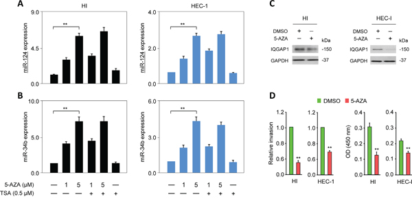 Figure 5: MiR-124 is epigenetically silenced in endometrial cancer cells. A, B. HI and HEC-1 cells were treated with 5-aza-2'-deoxycytidine (5-AZA), Trichostatin A, or both, after which, quantitative PCR was used to measure the expression levels of miR-124 (A) and miR-34b (B). C, D. IQGAP1 protein levels (C), invasion, and proliferation (D) in endometrial cancer cells after treating with 5-AZA.