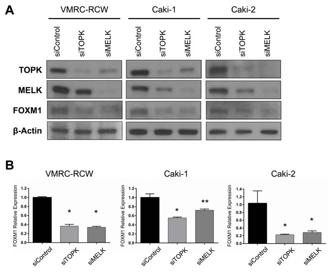 Figure 2: Both TOPK and MELK regulate expression of FOXM1. A. Silencing of TOPK expression downregulated FOXM1 protein level as similar as MELK affected on it in kidney cancer cell lines. B. Both siTOPK and siMELK downregulated FOXM1 expression in the transcriptional level. *p < 0.01, **p < 0.05 compared with the corresponding value of the siControl group.