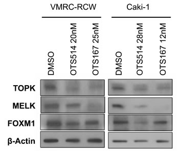 Downregulation of TOPK, MELK and FOXM1 by OTS514 and OTS167