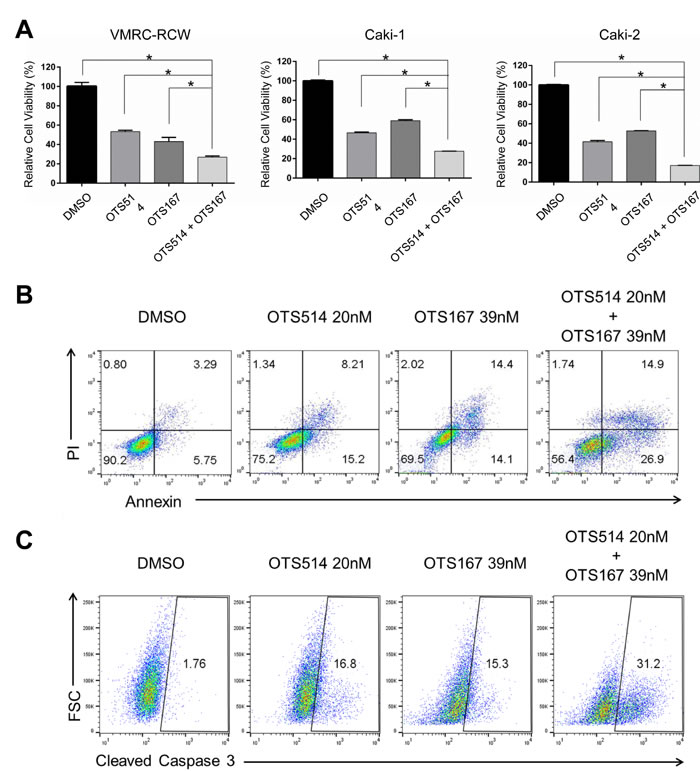 Figure 7: The effects in the decrease of kidney cancer cell viability by combination of OTS514 and OTS167. A. The combination of OTS514 and OTS167 at the concentration of IC50 values significantly revealed growth-suppressive effects on kidney cancer cells compared with the treatment of a single compound. The asterisk indicates p < 0.01 compared with the treatment of a single compound. B. Early stage of apoptosis assessed by Annexin and PI staining of kidney cancer cells. The combination of OTS514 and OTS167 at the concentration of IC50 values significantly increased 14.7 ± 2.6 % (compared with OTS514 alone) or 10.6 ± 2.6 % (compared with OTS167 alone) of apoptotic cells (p = 0.001 and p = 0.001, respectively). C. Apoptosis was examined by the levels of cleaved caspase 3 in kidney cancer cells. Dual inhibition with OTS514 and OTS167 significantly increased 10.8 ± 3.1 % (compared with OTS514 alone) or 12.5 ± 2.9 % (compared with OTS167 alone) of late stage population of apoptosis compared with either inhibition alone (p = 0.03 and p = 0.02, respectively). Flow cytometry figures are representative of three independent experiments.