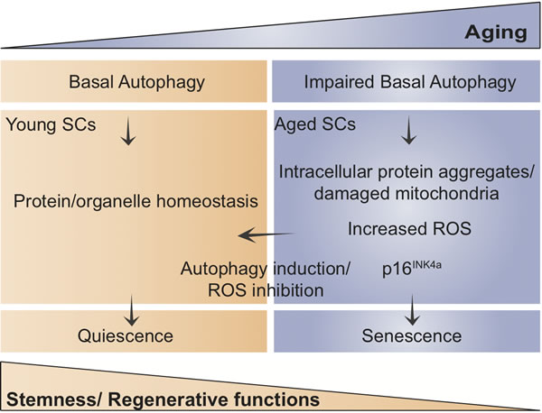 Taken together, quiescence protects stemness through active autophagy in SCs, and loss of autophagy with aging accounts for damaged mitochondria accumulation and increased ROS levels and consequent senescence entry. Further identification of molecular pathways implicated in stemness maintenance and dysregulation in aging and disease will have important implications in stem cell-based regenerative medicine.