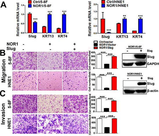 Figure 3: NOR1 suppresses the slug-induced EMT process and invasiveness of NPC cells (A) qRT-PCR analysis of the EMT transcription factor Slug and the epithelial marker keratin in NPC 5–8F, and HNE1 cells expressing control vectors pIRES or pIRES/NOR1. (B) Tumor cell migration assay. Ectopic expression of NOR1 suppresses migration of NPC 5-8F and HNE1 cells, but migration was rescued by concomitant transfection with a Slug expression plasmid. The graph represents summarized data of five independent experiments. Expression of exogenous Slug protein in transfected cells was determined by western blotting. (C) Tumor cell invasion assay. The same cells described in (B) were subjected to a tumor cell invasion assay. The graph provides summarized data of five independent experiments. **P < 0.01, ***P < 0.001 relative to the control cell data.