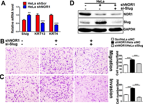 Figure 4: Stable silencing of endogenous NOR1 induces EMT-like properties, migration, and invasion of HeLa cells via upregulation of slug. (A) qRT-PCR analysis of the EMT transcription factor Slug and the epithelial markers keratin in HeLa cells with or without NOR1 expression. (B) Tumor cell migration assay. Stable silencing of NOR1 promotes migration of HeLa cells, but migration was alleviated by concomitant inhibition of Slug. (C) Tumor cell invasion assay. The same cells described in B were subjected to a tumor cell invasion assay. The graph provides summarized data of five independent experiments. (D) Scrambled shRNA or NOR1 shRNA along with Slug siRNA-transfected HeLa cells were subjected to western blotting. **P < 0.01, ***P < 0.001 compared to the control cells.