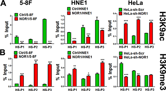 Figure 5: NOR1 expression induces chromatin remodeling of slug promoter regions in cancer cells. ChIP-qPCR assay: tumor cells with or without NOR1 expression were subjected to ChIP with antibodies specific to acetyl-H3K9 (H3K9Ace), trimethyl-H3K9 (H3K9Me3), or control IgG, followed by amplification with three PCR primers sets(HS-P1, HS-P2 and HS-P3) specific for the slug promoter regions. Data show the representative results from three independent experiments. *P < 0.05, **P < 0.01, ***P < 0.001 compared to the control cells.