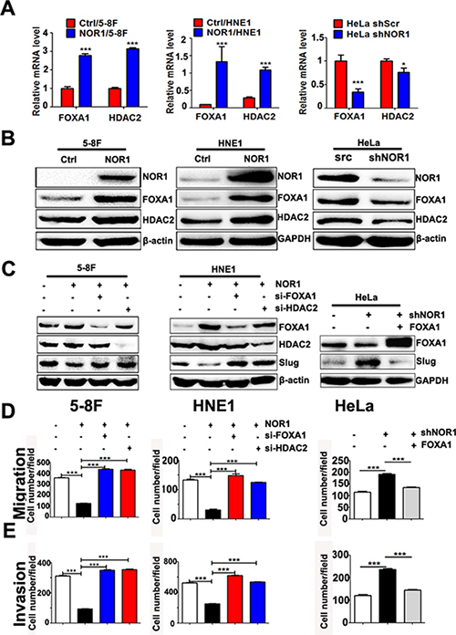 Figure 6: NOR1 inhibition of slug expression and malignant behaviors of cancer cells are dependent on FOXA1 and HDAC2. (A) qRT-PCR assay; ectopic expression of NOR1 or silencing of endogenous NOR1 leads to upregulation or downregulation of FOXA1 and HDAC2 mRNAs in cancer cells, respectively. (B) Western blot assay; ectopic expression of NOR1 or silencing endogenous NOR1 leads to up-regulation or down-regulation of FOXA1, HDAC2 proteins in cancer cells respectively. (C) Western blot assay; silencing either FOXA1 or HDAC2 using siRNAs results in recovery of Slug protein in NOR1-expressing NPC cells. Conversely, ectopic expression of FOXA1 protein leads to decreased Slug protein levels in NOR1-silenced HeLa cells. (D) Tumor cell migration assay; silencing either FOXA1 or HDAC2 using siRNAs rescues the migration of NOR1-expressing NPC 5–8F and HNE1 cells, while ectopic expression of FOXA1 suppresses the migration of NOR1-deficient knockdown HeLa cells. (E) Tumor cell invasion assay. The same cells described in (D) were subjected to a tumor cell invasion assay. The graph provides summarized data of five independent experiments. *P < 0.05, ***P < 0.001 compared to the control cells.