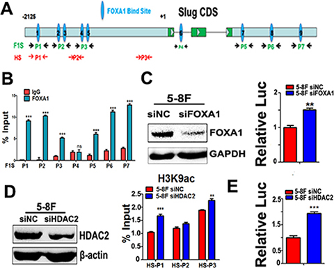 Figure 7: Either FOXA1 or HDAC2 negatively regulates slug transcription. (A) A schematic illustration of slug gene structure and the potential binding sites for different primer sets. Seven primer sets named as F1S-P1~ F1S-P7 were used for validation of FOXA1 binding sites on Slug promoter regions and downstream 3-UTR region. Three primer sets named as HS-P1~ HS-P3 were used for amplification slug gene DNA fragments associated with acetylated-H3K9. (B) ChIP was performed by using anti-FOXA1 antibody, and qPCR following ChIP was performed to identify the binding sites in the Slug promoter and downstream 3-UTR region in 5–8F cells by using seven primer sets(F1S-P1~ F1S-P7). Normal rabbit IgG was used as a negative control. The quantification of the band intensity of PCR products is shown on the right side. (C) Activation of slug promoter activity by co-transfection with FOXA1-targeted siRNAs in 5–8F cells. FOXA1 protein levels were measured by western blotting. Relative luciferase activities of the slug promoter are shown. Values are the mean of three independent assays, and the error bar is the standard deviation of the mean. (D) ChIP was performed using anti-acetylated-H3K9 antibody, and qPCR following ChIP was performed to compare the changes of slug promoter-associated H3K9-acetylation levels after silencing HDAC2 in 5-8F cells. Increased slug promoter-associated H3K9-acetylation levels was observed by silencing of HDAC2 in 5–8F cells. HDAC2 protein levels were measured by western blotting. (E) Activation of slug promoter activity by co-transfection with a HDAC2-targeted siRNAs in 5–8F cells. Relative luciferase activities of the slug promoter are shown. Values are the mean of three independent assays, and the error bar is the standard deviation of the mean. **P < 0.01, ***P < 0.001 compared to the control cells.
