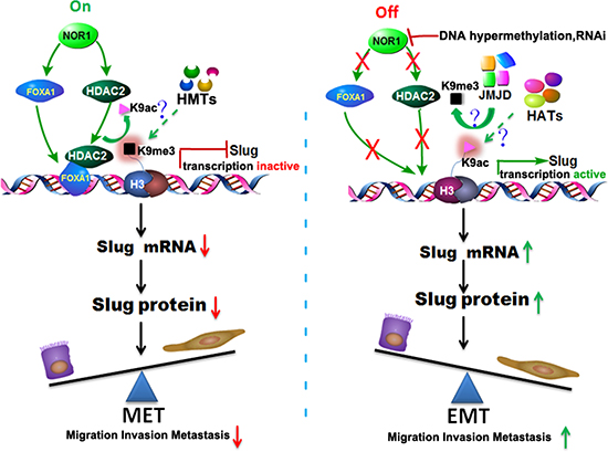 Figure 8: Schematic illustration of the NOR1-FOXA1/HDAC2-SLUG regulatory network in the EMT process of NPC. In normal nasopharyngeal epitheliums, high levels of NOR1 expression lead to optimal expression of FOXA1; FOXA1 then translocates to the nucleus, recruits HDAC2, and binds to the slug promoter region, resulting in de-acetylation and secondary tri-methylation of Slug-associated H3K9. The transcription of Slug is repressed and Slug protein levels are decreased, so the cells are maintained as epithelial cells. During NPC development, NOR1 is silenced by DNA hypermethylation or deletions, which in turn results in a decrease in the expression of FOXA1 and HDAC2, thus removing the inhibitory effect on the transcription of slug. The transcription of slug is activated and Slug protein production is upregulated, subsequently leading to the Slug-induced EMT process. HMTs, histone methyl transferases. JMJD, Jumonji domain–containing protein histone demethylases. HATs, histone acetyltransferases.