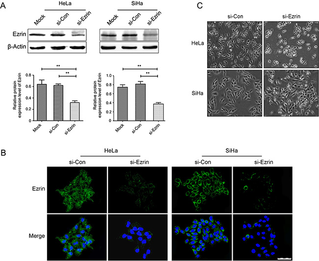 Figure 2: Ezrin was knocked down by siRNA in cervical cancer cells by western blot and IF staining. (A) Ezrin protein expression was inhibited in si-Ezrin-transfected HeLa and SiHa cells compared with si-control cells, as demonstrated by western blot (P < 0.05). (B) Cytoplasmic Ezrin (green) protein expression was inhibited in si-Ezrin-transfected HeLa and SiHa cells compared with si-control cells, as demonstrated by IF staining. DAPI staining (blue) was included to visualize the nucleus. (C) Ezrin-depleted cells increased cell-cell contacts compared with control cells.