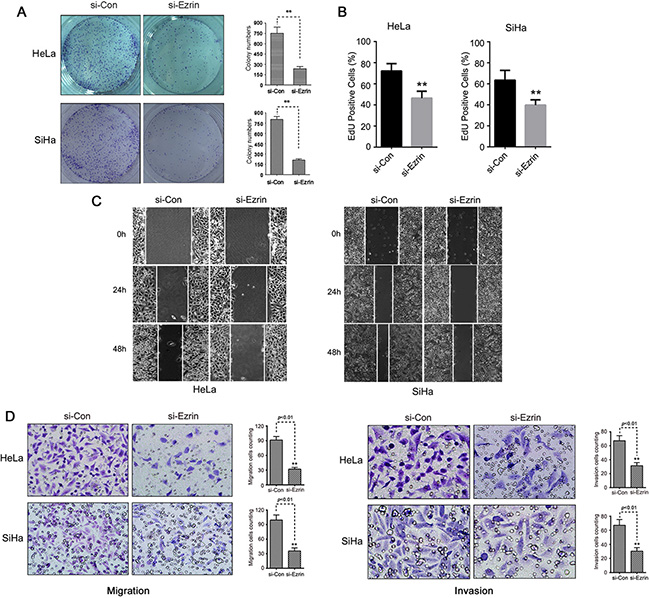 Figure 3: Ezrin knock-down decreased the growth and the ability of migration and invasion of cervical cancer cells in vitro. (A) The number of colonies per plate was counted. Data are shown as mean ± standard deviation of at least three independent experiments. (B) Proliferating capability of transfected cells was evaluated using EdU incorporation. (C) Scratch wound-healing assay was used to determine the effects of si-Ezrin on HeLa and SiHa cell motilities. (D) Migration of Ezrin knock-down cells was measured by transwell migration assay. The invasive abilities of HeLa and SiHa cells were determined in Boyden chamber assay after transfection with si-Ezrin or si-control. The results were quantitated by counting invading cells in five randomly chosen high-power fields for each replicate. P values were obtained using t-tests.
