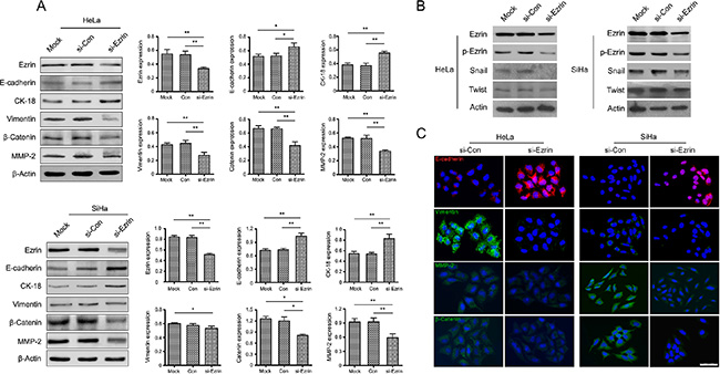 Figure 4: Ezrin regulates EMT in cervical cancer. (A) Western blot analysis of EMT markers in HeLa and SiHa cells transfect with si-Ezrin and si-control. β-Actin was used as a loading control. (B) Western blot analysis of Ezrin, p-Ezrin, transcription factor Snail and Twist expressed in si-Ezrin and si-control cells. (C) Expression of EMT markers was detected by IF staining in HeLa and SiHa cells transfect with si-Ezrin and si-control.