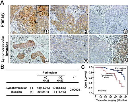 ) with lymphovascular invasion (×200). (B) Perinuclear expression pattern of Ezrin protein was closely related to lymphovascular invasion status in cervical cancer. (C) Kaplan-Meier survival analysis showed that the overall survival of patients with perinuclear Ezrin expression pattern was significantly better than that of patients with the cytoplasmic staining pattern of Ezrin.