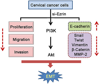 In vivo experiments also showed that Ezrin KD reduced the ability of cervical cancer cells to cross the CAM surface and infiltrate the underlying stroma. Overall, these studies suggest that Ezrin promotes cervical cancer cell proliferation, invasion, and metastasis through EMT (Figure 8).