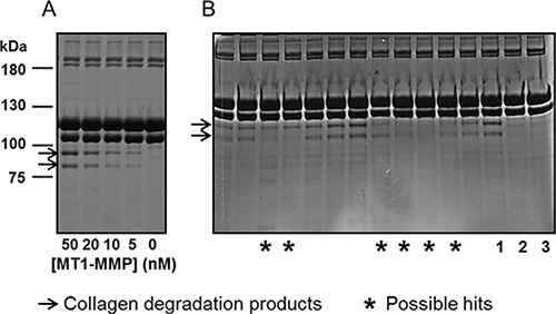 Figure 1: MT1-MMP scFv’s selected for the ability to prevent collagen cleavage. (A) Aliquots of ectodomain MT1-MMP (50, 20, 10, 5 or 0 nM) were incubated with fibrillated collagen type I for 16 hours at room temperature. The reaction products were analyzed by reducing SDS-PAGE. Collagen cleavage was observed as the conversion of the Mr ~100 kDa bands of collagen type I to the Mr~75 kDa ¾-fragments. (B) In separate reactions, ectodomain MT1-MMP was pre-incubated with E.coli. supernatant containing scFv-antibodies selected to MT1-MMP. As indicated by stars, some scFv’s were identified as possible hits for interfering with MT1-MMP catalyzed collagen cleavage. In lanes indicated by numbers, MT1-MMP was pre-incubated with control Fc-scFv DES (1), with CT1746 (2) or sample without MT1-MMP (3).