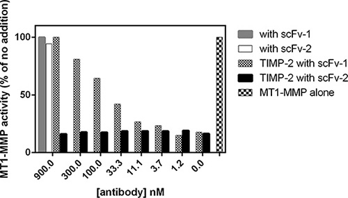 Figure 2: MT1-MMP scFv’s selected for the ability to interfere with interactions to TIMP-2. Selected scFv’s were screened for the ability to compete with TIMP-2 for MT1-MMP binding. The activity of ectodomain MT1-MMP towards a small fluorogenic peptide substrate was inhibited by TIMP-2, but not by selected scFv’s (scFv 1 and 2). However, the TIMP-2 inhibition could be competed away by some scFv’s (scFv-1), but not by others (scFv-2), as indicated in the figure.