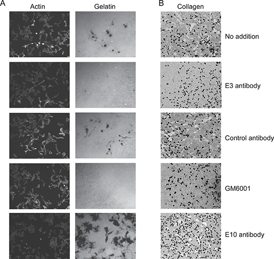 Figure 3: Lead Fc-scFv’s inhibit cell-surface MT1-MMP gelatinolytic and collagenolytic activity. HT-1080 cells were cultured on fluorescently-labeled gelatin (A) or collagen film (B) in the absence or presence of purified MT1-MMP Fc-scFv’s, DES control or GM6001. For gelatinolytic activity, cells were fixed after 18 hours and imaged. Staining of actin ensured similar cell numbers in areas of imaging. For collagenolytic activity, cells were fixed after 3 days of incubation and collagen stained with Coomasie Brilliant Blue. As exemplified by Fc-scFv E3, a few clones were able to inhibit both gelatin and collagen degradation. Control Fc-scFv DES served as negative control, whereas GM6001 gave complete inhibition (A and B).